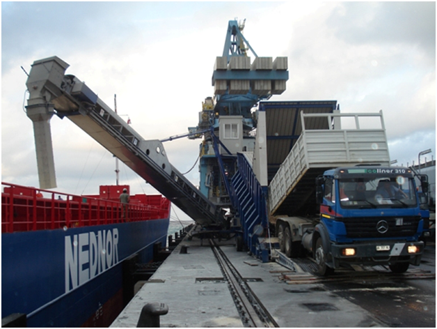 裝船機進料口一般在輸送帶上方,位置很高,自卸卡車卸貨時車廂后部位置很底;采用裝載機雖然能將物料送到一定高度,但效率很差;裝船機能力一般很大,要確保裝船機的運行效率,須有多輛運輸車為其供料,最大限度地提高系統的處理速度和使車輛定位延遲效應最小化,且具備穩流功能,保證連續、均勻、平穩地供料;自卸卡車每車二三十噸,要讓車子迅速卸貨,須提供緩沖儲存裝置;輸送帶水平段要有很大的強度,承受物料對進料裝置的強烈沖擊;進料裝置與裝船機要能有分有合,移動時要同步,具有移動的靈活性;該裝置可以輕松遷移到其它港口處,從而提升設備的利用率;當輸送有塵物料時,可配套高效的除塵設施。